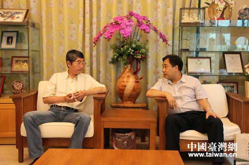 襄阳市长别必雄(右)与台南市农会总干事吴正仁进行交流。(襄阳市台办 尚明洋 摄)