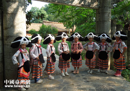 长角苗女孩在梭戛生态博物馆大门前欢迎调研组一行。(图片来源:六盘水市台办)