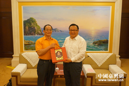 威海市委书记、市人大常委会主任孙述涛(右一)与台湾两岸情经贸交流协会会长王培旺(左一)互赠纪念品。(图片来源:威海市台办)