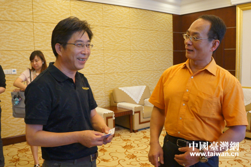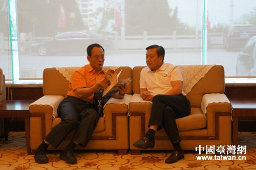 威海市台办主任于连波(右一)与台湾两岸情经贸交流协会会长王培旺(左一)亲切交谈。(图片来源:威海市台办)