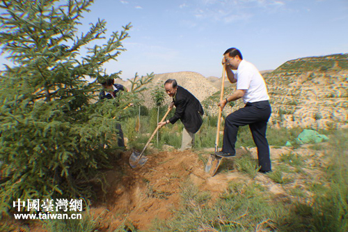 台湾新党主席郁慕明亲手栽种陇台亲情树。(图片来源:甘肃省台办)