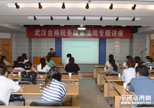 中国台湾网7月1日武汉消息 为帮助台商及台资企业学习、了解、掌握国家税收法律法规,避免因误读误判而出现违规行为,6月28日,武汉市台办、武汉台协联合举办台商税务政策法规专题讲座。武汉冠捷、统一、台玻、国泰产险、元茂光电、提爱思全兴、华城电机、三叶士林电机等近50家在汉台资企业负责人或财税工作人员参加了培训学习。