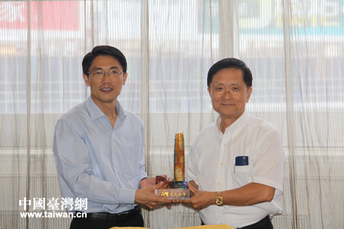东莞市台协会会长谢庆源与枣庄市政府副市长张兵(左)互赠礼品。(图片来源:枣庄是台办)