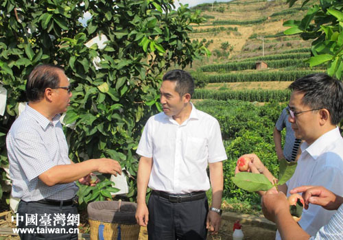 四川省台办副主任赵宇(中)在攀枝花盐边台湾农民创业园考察调研。(图片来源:四川省台办)