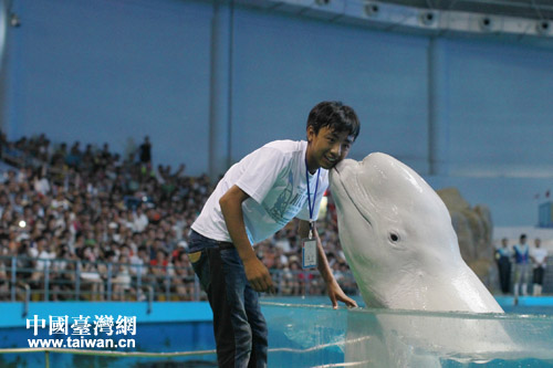 彝族孩子与白鲸“亲密接触” 。(图片来源:青岛市台办)