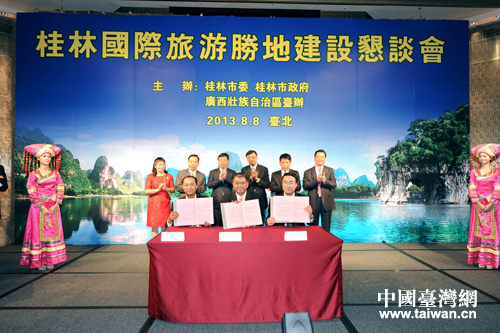 桂林旅游发展总公司、桂林旅游股份有限公司与台湾旅行商业同业公会在台北签署旅游合作备忘录。(图片来源:广西台办)