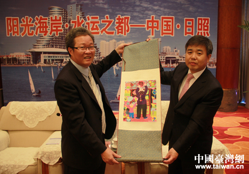 日照市市长李同道向客人赠送日照农民画。(图片来源:日照市台办)