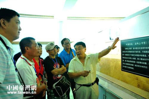 高雄市新闻记者会参访团一行参观眉山市青神县中国竹艺城,图为竹编大师陈云华向参访团一行介绍竹编精品《清明上河图》。(图片来源:四川省台办)