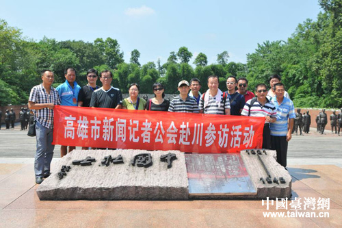 高雄市新闻记者会参访团一行参观位于成都大邑县安仁镇的建川博物馆,图为高雄市新闻记者会参访团一行在抗日名将中国壮士广场合影。(图片来源:四川省台办)