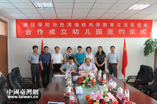 中国台湾网8月27日潍坊消息 8月27日,潍坊学院与台湾海峡两岸教育交流促进会就合作成立幼儿园正式签约。台湾海峡两岸教育交流促进会将在潍坊学院潍坊幼教特教师范学校校区投资建设幼儿园项目,该幼儿园将采用美国“芝麻街”教育模式和台湾先进的教育理念,配套以符合幼儿智商、情商、品德、体能、艺术素养全面发展的高端设施。(中国台湾网、潍坊市台办联合报道)