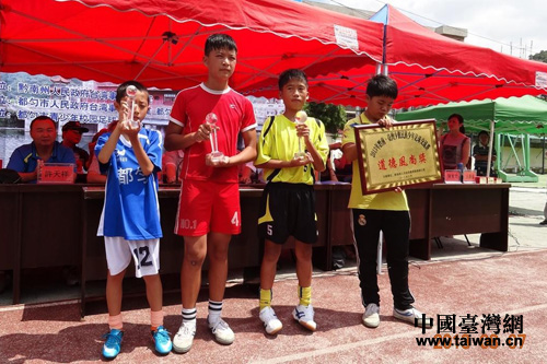 中国台湾网8月31日都匀消息 黔南·台湾少数民族少年足球交流赛8月6日至7日在都匀市举行,台东丰里小学,都匀市第九小、十一小、杨柳街小学少年足球队共四个队参赛,进行循环赛。通过两天的角逐圆满闭幕。台东丰里小学足球队摘下桂冠。