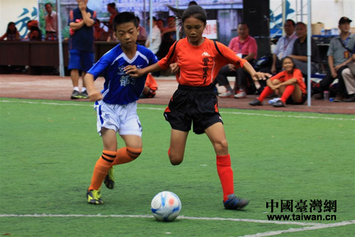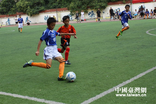 第六场,台湾丰里小学少年足球队与杨柳街小学少年足球队争夺第一名。(图片来源:黔南州台办)