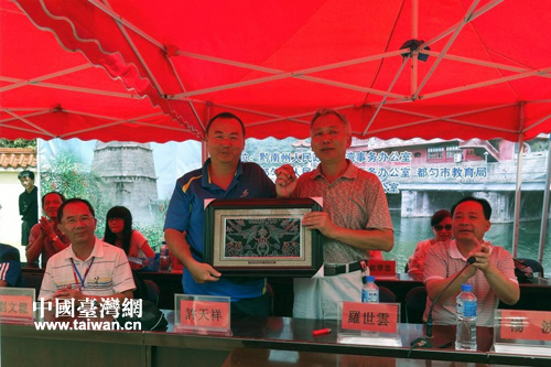 黔南州台办向交流团赠送了礼品——水族马尾绣。(图片来源:黔南州台办)