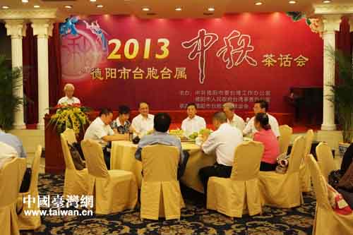 中国台湾网9月18日德阳消息 9月17日,德阳市台办、台联会共同举办全市台胞台属2013年中秋茶话会,来自县(市、区)各条战线的台胞台属代表及县级台办主任、三大厂有关负责人等70余人参加活动。德阳市政协副主席余存贵、市台办主任林永成和市台联顾问单位负责人出席茶话会,与全市台胞台属代表欢聚一堂,喜迎团圆佳节,畅叙同胞亲情,共话两岸发展。