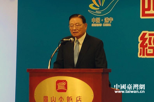 台湾海基会原董事长、中国国民党原副主席、台湾“三三会”会长江丙坤致辞。(遂宁市台办供图)