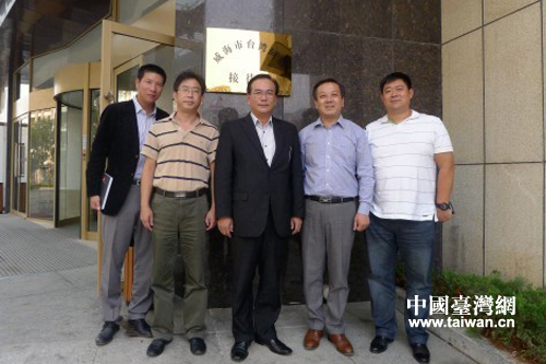 威海市台办主任于连波(右二)与台湾中华航空公司王博荣(中)在威海市台湾同胞接待站前合影。(威海市台办供图)