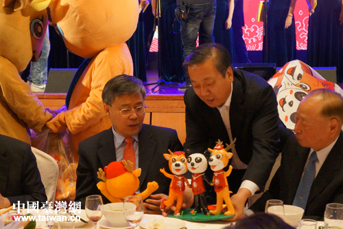 威海市台办主任于连波在联谊会现场展示威海制作的动物玩偶。(图片来源:威海市台办)