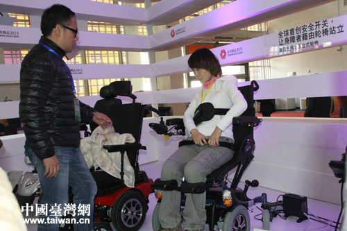 记者现场体验可站立轮椅,独创的安全开关,让身障者可以藉由轮椅站立,促进三大循环系统的机能,改善健康状况,开拓更多不同的生活面貌。(中国台湾网 郭庆娜 摄)