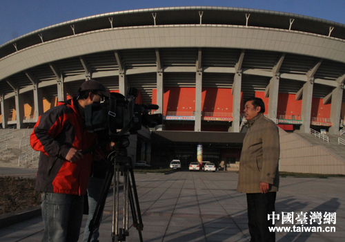 台湾中天电视台记者采访淄博市体育中心负责人。(图片来源:淄博市台办)
