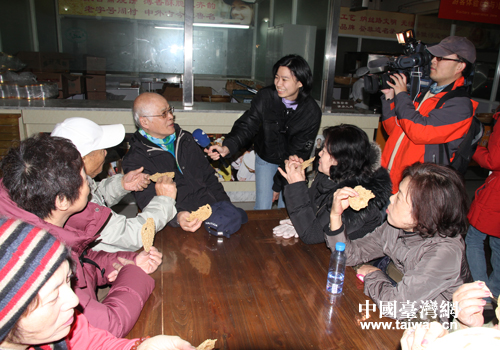 拍摄中恰遇台湾游客到访周村古商城,记者现场采访正在品尝周村烧饼的台湾游客。(图片来源:淄博市台办)
