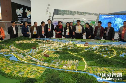 张嘉(右四)为参观高要规划馆的台湾客商们介绍高要市城区规划发展。(图片来源:肇庆市台办)