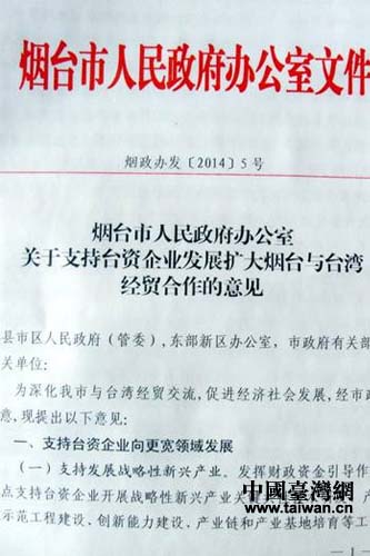 烟台市政府出台支持台资企业发展的意见。(图片来源:烟台市台办)