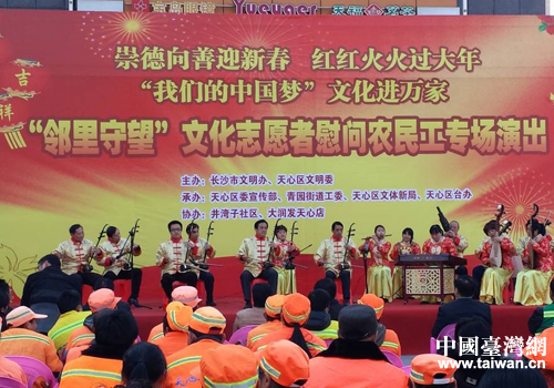 中国台湾网1月24日长沙消息 1月22日下午,由长沙市文明办、天心区文明委牵头主办,天心区台办与区直相关单位和街道共同承办,台企大润发超市天心店负责协办的“邻里守望”文化志愿者慰问农民工专场演出在大润发超市前坪火热上演。来自天心区群众文艺团队的文化志愿者们现场为市政、园林、建筑、环卫等行业500多名农民工奉献了一场冬日里的“文化盛宴”。