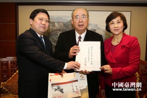中国台湾网2月13日台北消息 2月11日下午,在台北开封街伯仲文教基金会,中国国民党荣誉主席、世界客属总会总会长吴伯雄亲切会见了汴梁晚报记者台湾行特别报道组。在欣然看完报道组带去的开封市委书记祁金立的亲笔信后,吴伯雄表示,将全力帮助开封成功举办世界客属第27届恳亲大会,并题词“经济合作手携手文化交流心连心”。