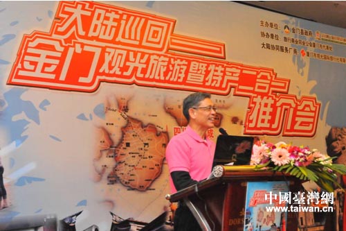 金门县政府副县长吴友钦向与会人员推介金门观光旅游及特产业。(图片来源:四川省台办)
