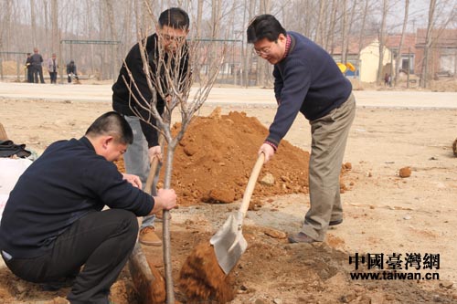 市台办主任王秀辉与大家一起植树。(图片来源:淄博市台办)