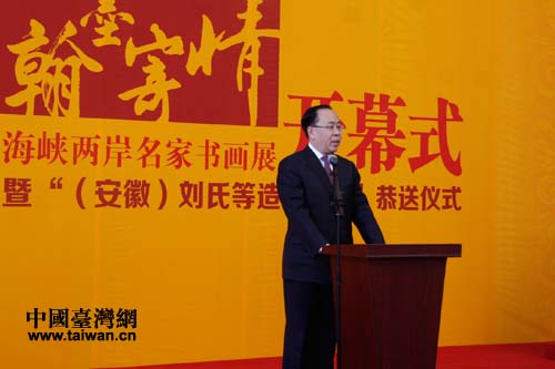 天津市武清区区委书记张勇在海峡两岸名家书画展暨“刘氏等造石佛塔”恭送仪式上致辞。(中国台湾网 雍紫薇 摄)