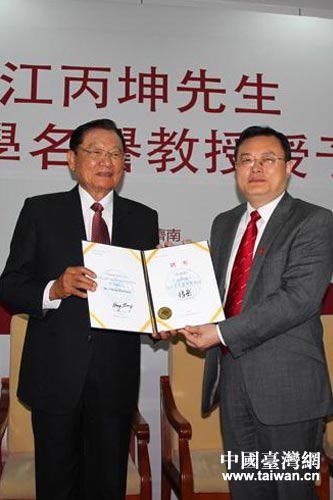 张荣校长向江丙坤先生颁发山东大学名誉教授聘书。(图片来源:山东省台办)