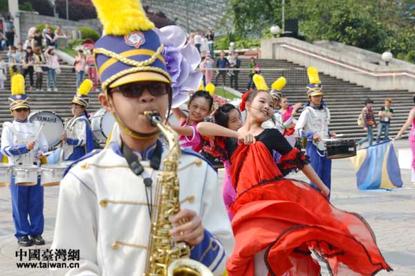 台湾嘉义博爱管乐队在东方明珠广场表演。(葛凤章 摄)