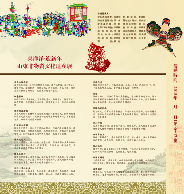目前,山东入选联合国教科文组织非物质文化遗产名录8项,国家级代表性项目名录173项,省级代表性项目名录555项,国家级代表性传承人60名,省级代表性传承人333名,成为名副其实的非物质文化遗产大省。此次展览活动由山东省文化厅、山东省台办主办,山东省文化馆、中华艺术馆承办。