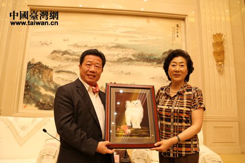 花建慧向王正典赠礼品。(图片来源:安徽省台办)