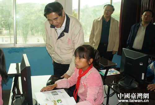 黄志贤在可乐乡农场小学电脑室观看小学生操作电脑。(图片来源:赫章县台办)