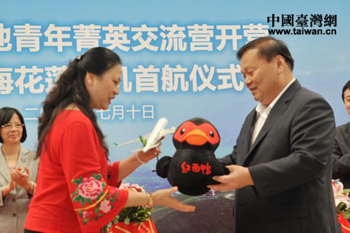 中国台湾网7月10日上海讯 首个上海直飞台湾花莲由春秋航空公司执飞的包机今天14:55从上海浦东国际机场启航,由上海市台办、上海市教委与花莲县政府共同主办的沪台两地青年菁英交流营正式拉开帷幕。上海市政府副秘书长宗明、上海市台办巡视员李雷鸣、花莲县政府秘书长颜新章、上海市教委副主任丁晓东、春秋航空公司总经理张秀智等出席了在上海浦东国际机场举办的首航仪式。