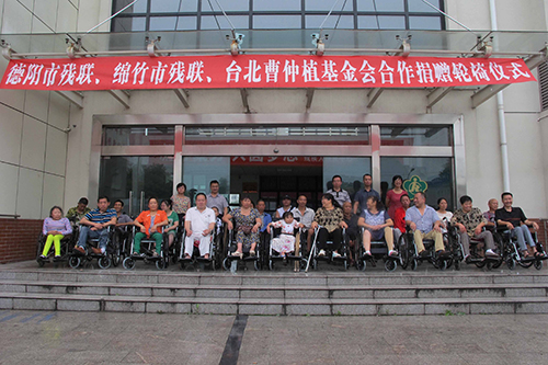 中国台湾网7月20日四川绵竹讯 日前,台北曹仲植基金会爱心轮椅捐赠仪式在绵竹市残疾人康复中心举行,德阳市残联副理事长陈文松、市台办纪检员谢锦辉、绵竹市残联理事长刘英出席捐赠仪式。