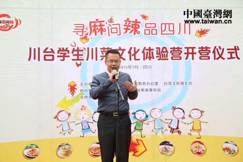 成都市郫县县委常委陈谊在开营仪式上致欢迎辞。(图片来源:四川省台办)