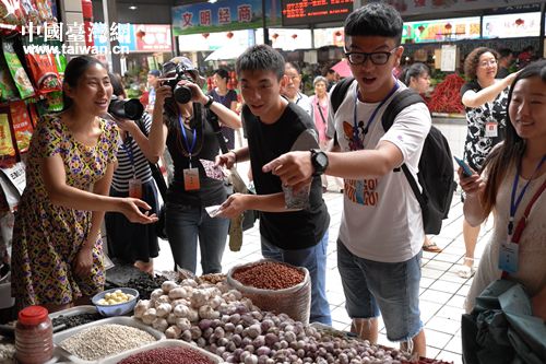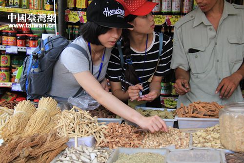 中国台湾网7月21日成都讯 7月21日,成都市金牛区黄忠菜市场来了一群特殊的客人,他们就是参加“寻麻问辣品四川”川台学生川菜文化体验营的20位来自台湾与四川各大高校的学生。带着寻找川菜香料的任务,学生们分成小组走进菜市场,根据图片寻找到相应的香料。