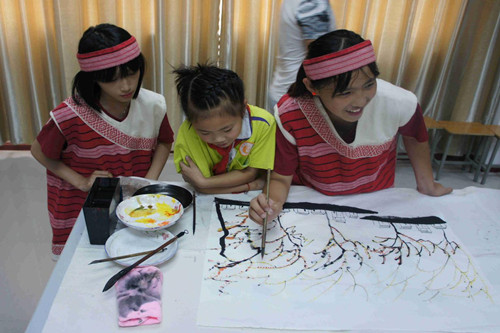 台湾学生与文昌一小学生(中)共画国画。(图片来源:四川省台办)