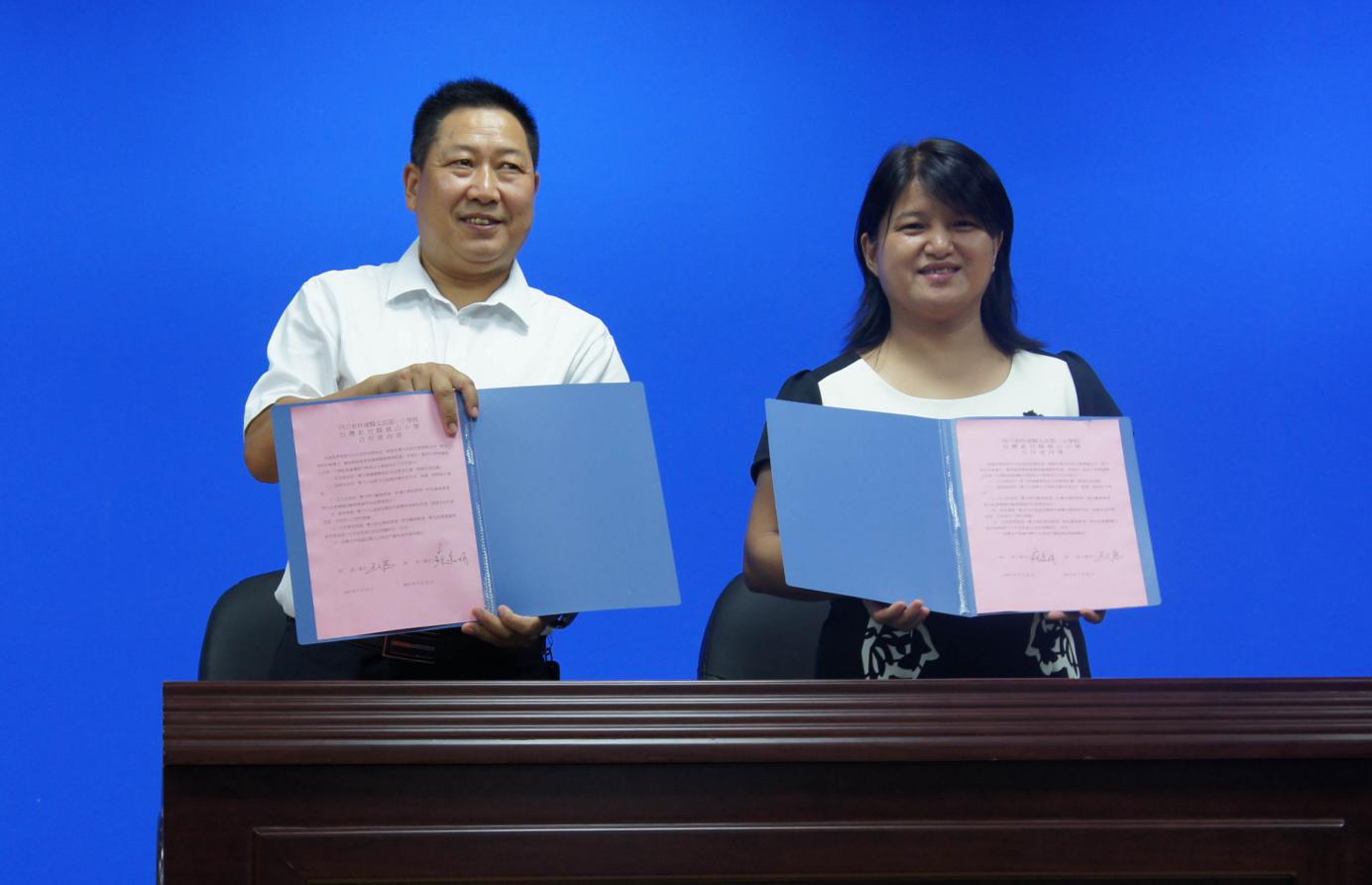 桃山小学校长苏美娟(右)与文昌一小校长王义富(左)签订合作意向书。(图片来源:四川省台办)