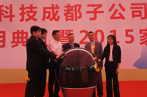台湾联发科技成都新办公楼正式启用,四川省台办主任周敏谦(左四)、台湾联发科技董事长蔡明介(左五)等出席并共同触发启动球。