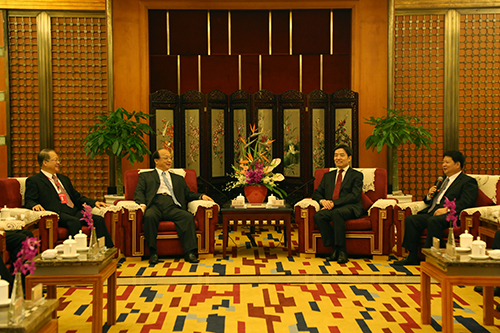 交流会前,四川省副省长甘霖(左三)和国务院台办副主任龙明彪(左四)共同会见了参加交流会的中国国民党前副主席、台中市前市长、旺旺集团副董事长胡志强(左二)、全国台企联荣誉会长丁鲲华(左一)等台湾嘉宾代表。