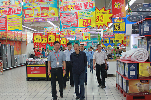 四川省台办主任周敏谦(前中)在绵阳台资企业大润发超市考察调研。(图片来源:绵阳市台办)