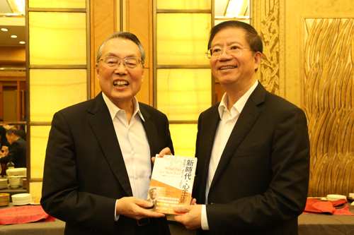 四川省人大常委会副主任彭渝(右)在成都宴见了台湾嘉宾一行,图为两岸创意产业合作论坛筹委会共同召集人、台湾台湾文化艺术基金会董事长施振荣先生(左)向彭渝副主任赠送自己的新书。