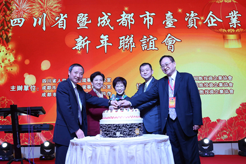 四川省台办主任周敏谦(左一)、成都市委常委陈建辉(左二)、中国国民党前副主席洪秀柱(中)、成都台协会长徐大伟(右二)、全国台企联荣誉会长张汉文(右一)共切新年蛋糕送祝福。