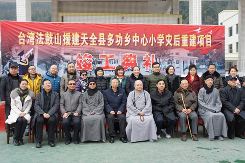 中国台湾网1月22日四川讯 1月21日,台湾法鼓山援建“4.20”芦山地震灾后重建项目——雅安天全县多功乡中心小学举行竣工仪式。四川省台办主任周敏谦、省人大民宗委主任王增建、省民宗委副主任杨伯明与台湾法鼓山住持果东法师等出席竣工典礼并为学校竣工揭牌。来自台湾、香港等地的法鼓山信众、义工和当地群众师生200余人参加竣工仪式。