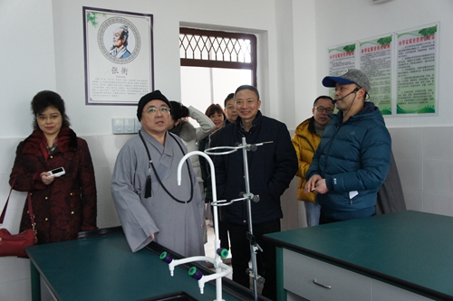四川省台办主任周敏谦(右二)、台湾法鼓山方丈果东法师(左二)一行参观新学校。