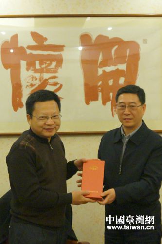 与福建省台联座谈,北京市台联秘书长张晓军(右)向福建省台联赠送纪念品。(图片来源:北京市台联)